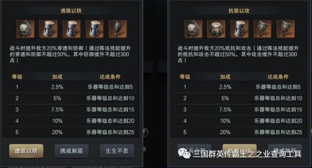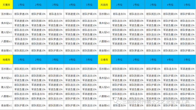 不同阵法,乐器放在每个位置上给予的加成都不一样,下图为乐器在每个阵法各个位置的加成总览