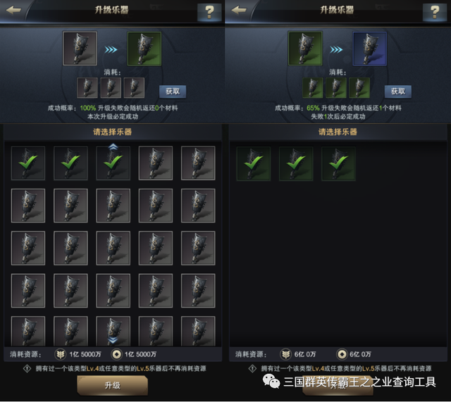 拥有同类型LV4的乐器或者任意类型LV5的乐器后升级不再消耗资源