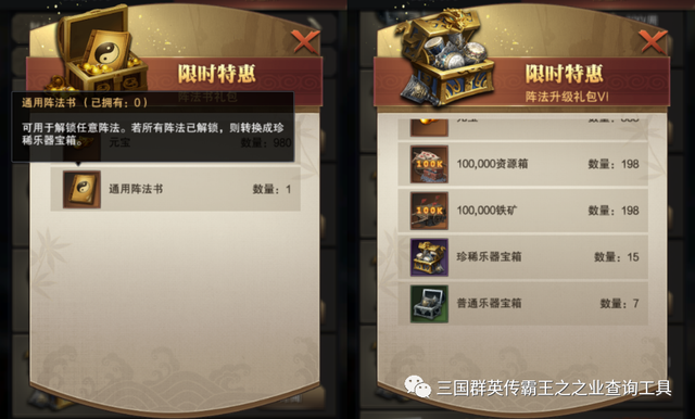 阵法书礼包和乐器礼包每周限购2次,每周三、六可购买