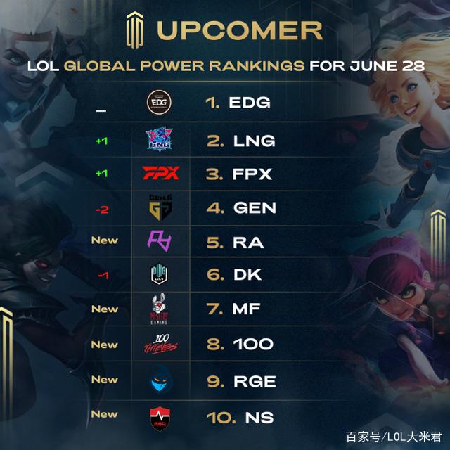 大家都知道上一次榜单排名还是在夏季赛刚开始,当时RNG因为刚夺冠没上场的原因,排在了战力榜第一位。而第2期的榜单变化就有点大了,积分榜前三已经被EDG,LNG和FPX霸占,排在第4的是Gen,至于第5名依旧是来自LPL的RA战队,DK战队排名下滑到第6名,随后是MF,100,Rge和NS。