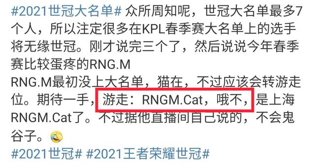 而春季赛加入的辅助最初并没有入选大名单,在春季赛中,RNGM的辅助位经常轮换,所以猫神可能在夏季世冠赛,迎来自己转型辅助后的首秀。