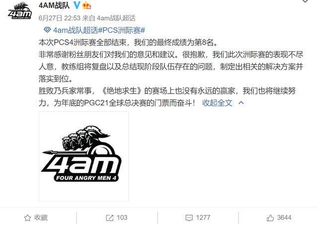 随着PCS4比赛落幕,4AM官博遗憾宣布了此次PCS4成绩止步第八名,并且向支持他们的观众和粉丝道歉。不过这并未平息粉丝的怒火,在评论下很多粉丝质疑4AM选手对待这次PCS4比赛的态度不够端正,更是有粉丝评论道:“每次说的都是屁话,改过吗?”