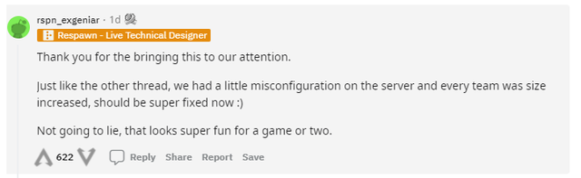 技术设计师Aaron L在一篇回复中表示:“我们的服务器上有一个小的错误设置,这使得每个团队的人数都变成了5个,现在应该被修复了。说实话,我觉得玩一两局这样的游戏也十分有趣。”