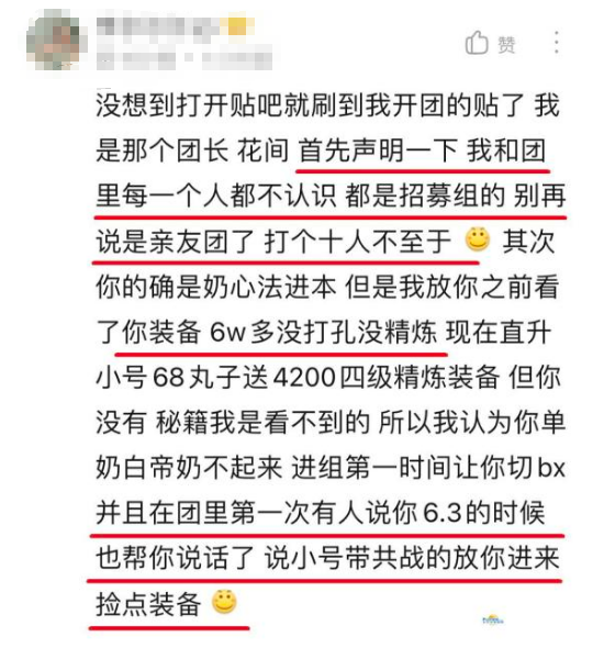 然而事实真是这样吗?关键是人家团长后来也出来澄清了,自始至终,人家都是抱着带个小号进来让她捡点儿装备的态度,而且,团里的每个人自己也都不认识,从头到尾也没说过一个滚字,难道现在的玩家脑补都这么全的嘛?