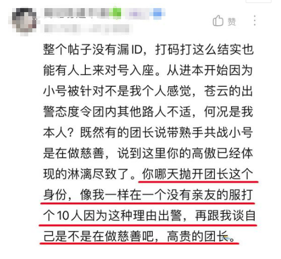 而且虽然帖子挂着“小号就不配打10人白帝江关,活该被亲友团阴阳怪气吗?”的标题,导致团长被骂了几百楼,可自己又没挂ID,团长对号入座关我什么事?