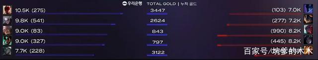 开局yoHan兰博节奏不错,先后抓死DK中下两条线,不过随后Vsta雷欧娜一波激进的进攻让前期的优势化为乌有。DK也自此也开始节奏不断,两条边线先后陷入劣势,唯一有一点优势的Chovy中路也遭到针对,不到14分钟HLE就落后5000多经济,仅镀层就落后1600。