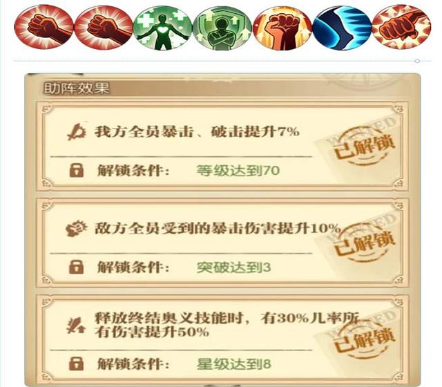 被动方面有两个攻击,还有基础的暴击,所以暴击率方面问题不大。助战方面很不错,都是全员可吃到收益的,而且还是纯输出类助战。如果后续雷利退位,可以转助战。突破材料是书+皇冠。