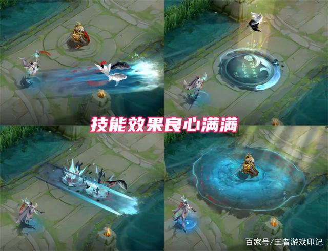 介绍完了局内模型,我们再来看一看局内特效,由于是联动水下博物馆,所以必然少不了鱼元素,普通攻击、一技能、二技能、三技能、四技能都出现了鱼,其中大招是蓝色的鱼,四技能是红色的锦鲤,而其它技能都是黑白颜色的,伴随着技能,还会有各种各样的文字,特效动感十足,极具文化特色,还有一种水墨风的感觉,似乎也是从西施四美皮肤移植过来的,可以说,这个特效还是非常良心的。