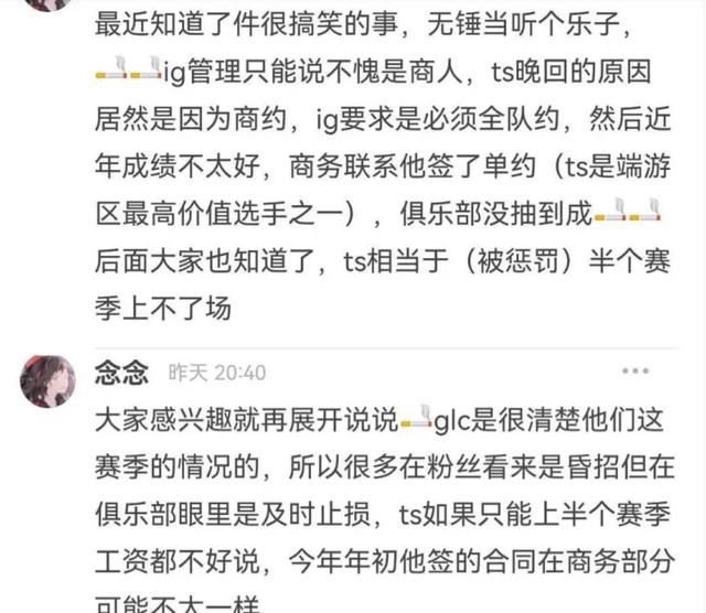 首先是iG的教练NoFe和Theshy是一起回中国放入这件事情就引发了粉丝的疑问,毕竟教练是5月份签下来的,难道Theshy也是拖到和教练才一起办理工作邀请函的吗?然后网友的爆料直接印证了这个猜测。作为商业俱乐部,iG管理层为了控制Theshy的工资。于是就卡住他的出场次数。(一般来说,选手的工资会和出场次数还有战绩挂钩,比如出场次数没有达到比赛场次的70%,可能就会扣工资之类的)