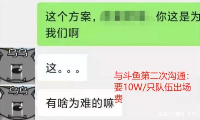 但万万没想到这个事件很快就反转了,原来斗鱼队伍没能参加天命杯S9并不是举办方虎牙直播没有邀请,而是斗鱼那边开出了一支队伍10万出场费的条件,不少人本来也不相信,毕竟这个价确实离谱,但在晒出了聊天记录之后,只能说这波斗鱼被打脸很惨。