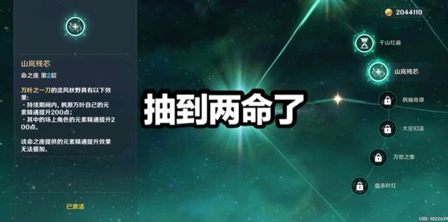 作为一名正直的LSP玩家,盟盟没有忍住,不仅将自己仅剩的3000多原石在万叶的祈愿池中使用了,而且还氪金了小一千,最终保底拿下了万叶。可是当我拿下万叶之后,我才发现,零命万叶的强度基本上等于四命的砂糖,万叶没有两命就好像胡桃没有满命、甘雨没有满命或者魈没有满命一样,因为两命的万叶可以给自己的和队友提供200点元素精通,而正是这200点元素精通,奠定了万叶成为T0级别辅助的基础。