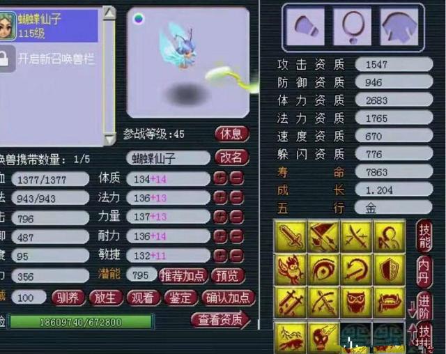 王谢的角色虽然出售了,但是王谢并没有中断自己追求个性宠的步伐,上面的这只拥有着14个技能的蝴蝶仙子就是王谢刚刚打造出来的个性宠,这只蝴蝶仙子的资质是比较好的,14个技能格子也让这只召唤兽在打完了全红之后又打上了苍鸾怒击技能,现在还缺一个剑荡四方或者善恶有报的套装。