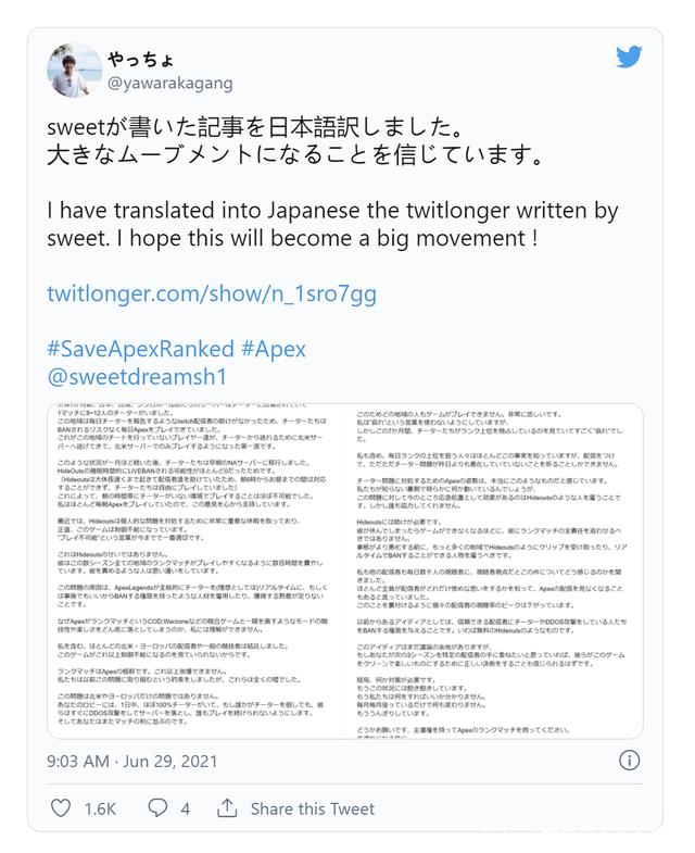 当然这样的生态,无论对于职业玩家或是实况主都是非常困扰的事,因此 sweet 希望官方可以正视并解决。 此篇文章还被日本玩家翻译,同时在推特广为流传,一度烧上热门趋势。