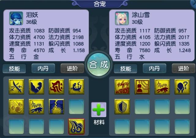 上面的这组炼妖就是想要合成出其不意和须弥真言双特殊技能召唤兽的,用的是一只七级能拥有着须弥真言的泪妖,另外是一只五技能拥有着出其不意的涂山雪,泪妖只认证了自己必带的水攻,所以上面的这组炼妖最理想的情况下可以合出拥有着13个技能的泪妖或者12个技能的涂山雪。