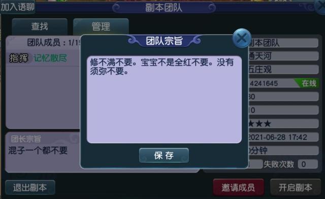 现在梦幻的队长对自己队友的要求变得越来越高了,就像上面的这位刷通天河副本任务的队长,他要求自己的队友满修宝宝,必须是全红,而且必须得有全红的须弥宠,其实仅仅只是要求这些硬件条件是可以理解的,在难度副本中自己队友的实力越强通关难度副本的效率就会越快,就是小编感觉上面的这位玩家刷通天河副本任务的时候有可能用不到须弥宠,因为在最终的boss战斗中须弥是扛不住伤害的。