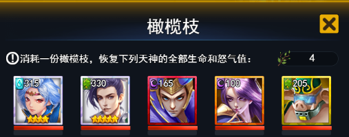 4.玩家可以在任务周常和神灯商店获得橄榄枝。橄榄枝可以让万神殿中的天神恢复全部生命值和怒气值。