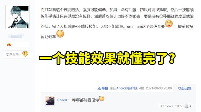 还有那些吐槽站姿什么的就不说了,关键是有些玩家居然是通过一个简单的技能效果就直接全懂完了?先不说现在就看到一个登场效果以及一个二技能的第一段,就算是全技能效果展示完了以后,你没打实战都未必能够太准确的判定这个忍者的强度上限。这下可好,就一个加具土命,就说技能有后摇,然后推断防反没有抓取,接着就是估计普攻也好不到哪里去。如果这只是一个调侃的内容,我觉得笑一笑就得了,但真要是有玩家这么认为,那就只能说“您真内行”!