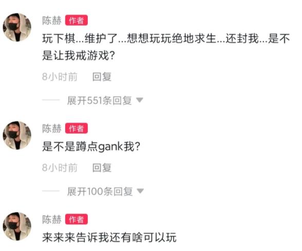 无奈的陈赫还在评论区写下:“玩下棋...维护了...想想玩玩绝地求生...还封我...是不是让我戒游戏?