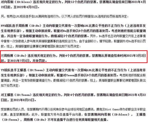 根据LPL官方当时发布的处罚公告来看,Bo禁赛4个月,从3月份开始到7月份结束,禁赛结束的时间就是1号。也就是说Bo已经过了禁赛期,理论上来讲是可以重返赛场的。