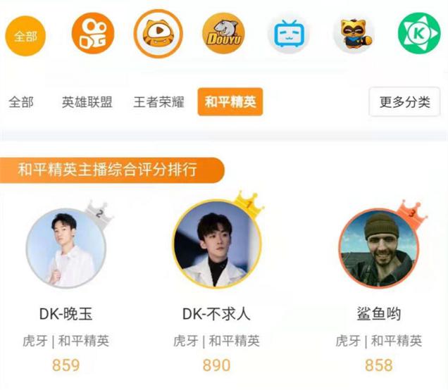 比如在王者荣耀版区,虎牙张大仙、等人雄踞榜单的前两名,从这里我们也能够看出虎牙在王者荣耀直播版区的影响能力有多高。除此之外在和平精英版区域当中,前4名当中有三名都是来自虎牙和平精英版区的,他们分别是第1名的不求人、第3名的晚玉以及第4名的鲨鱼哟。