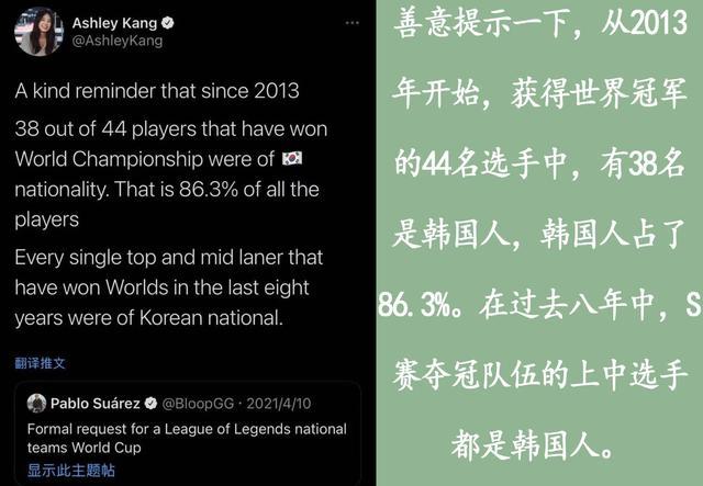 Ashley是LCK知名的电竞记者,她曾经发表过令LPL粉丝很深刻的言论,表示从S3到S10赛季里面但凡是获得冠军的队伍,中上两个位置一定是韩国人,也很骄傲地发表了一个令人无法反驳的数据,表示任何赛区的队伍想要夺冠,没有韩国人是不可能的,而且从S3赛季以来,所有的冠军选手里面,韩国选手占比为86.3%。