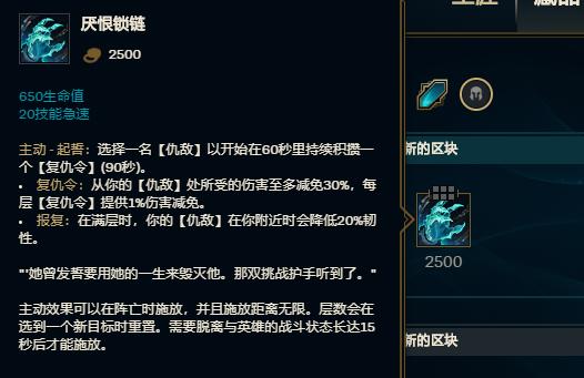 另外对于后期蒙多,有一件版本装备建议大家试试,就是新出炉的“厌恨锁链”,这件装备非常适合蒙多使用,尤其是后期单带时,直接给对面防守人员上一个“复仇令”,减少对方对于自己的输出,这样两人在作战时蒙多就有了很大的优势,很容易打出击杀来。