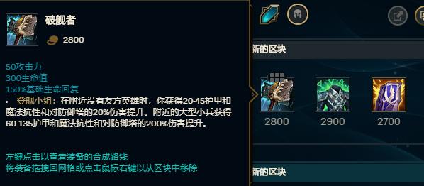 核心装备-【破舰者】,这件装备就是为了单带而生的!全面提升单带英雄的推进效率,同时这件装备的合成对于蒙多来说非常合适,【十字镐】+【小木槌】这两件小件能够增强蒙多对线期的作战能力和回复能力,对线期就可以出一个小木槌过渡,等到等级提升,中后期再合成【破舰者】进行单带。