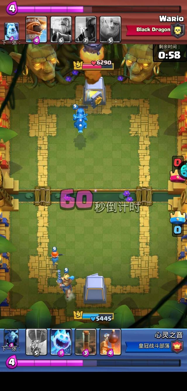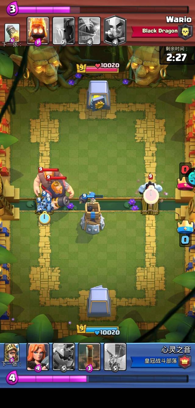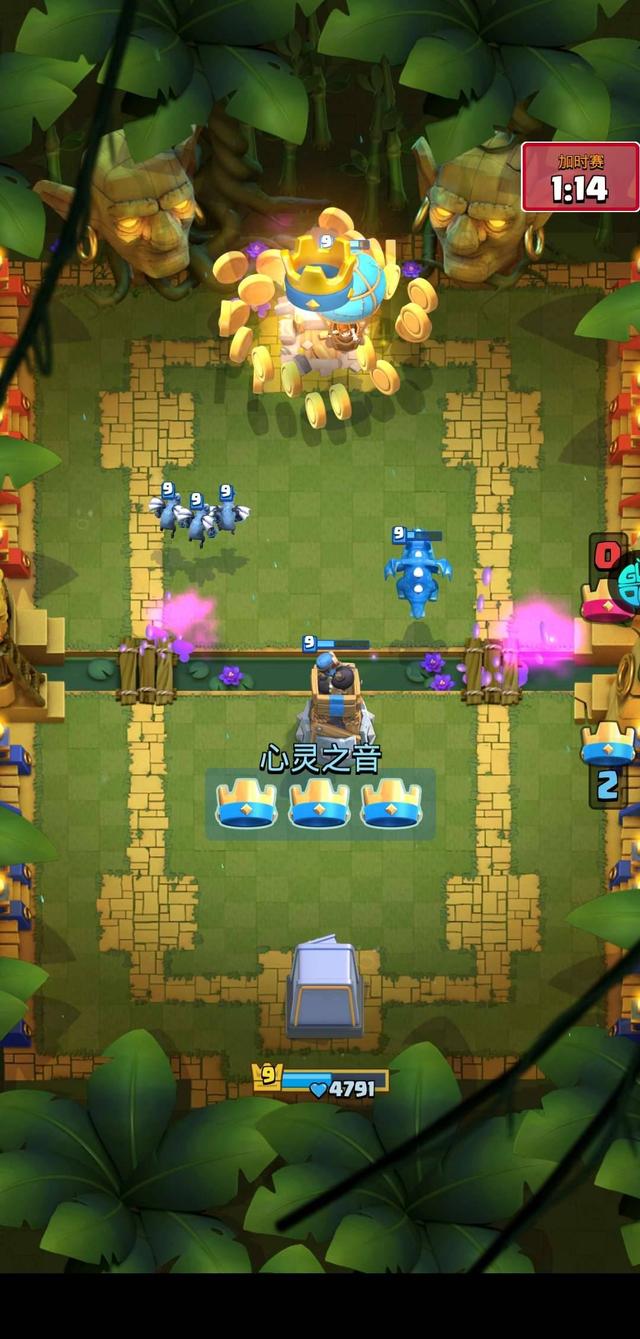 当对手出完大皮卡以后,我就直接出气球兵了。那是因为对手出完大皮卡以后,就没有再多余的圣水进行防守了,气球兵一碰对手的金库就塌了。所以打这个活动还是需要算好时机的。并且在中间我们俩对战的过程当中,对手差点翻盘,那么我用的技巧就是先让对手的卡牌去打金库,然后我再出卡牌,去打对手的卡牌,这样的话就防御住了。