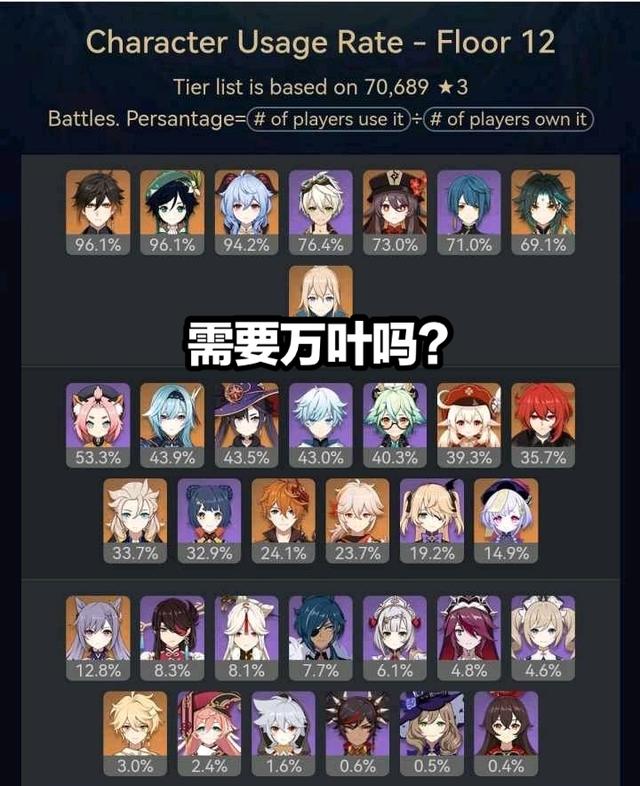 咳咳,从另一种角度来看,不需要万叶的玩家可以做到深渊满星,所以有万叶做到深渊满星,并不能说明万叶强。但是纵观这次深渊12层的角色使用率,我们可以看到,TOP8中出现了三个风系角色,分别是温迪、魈和琴,温迪聚怪,琴回生命值,魈打伤害,风系角色出场率很高【砂糖也有40%的使用率】所以从这个角度来看,万叶是志在必得的,毕竟满命万叶同时具备了魈的大招、温迪的大招、砂糖的被动的效果,这样的万叶你会抽吗?我的答案是【万叶很强,所以我选择等神里、宵宫和雷神】好了,本期内容结束了,我是盟盟,咱们有赞再见!