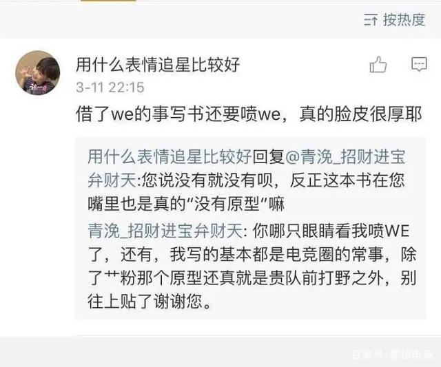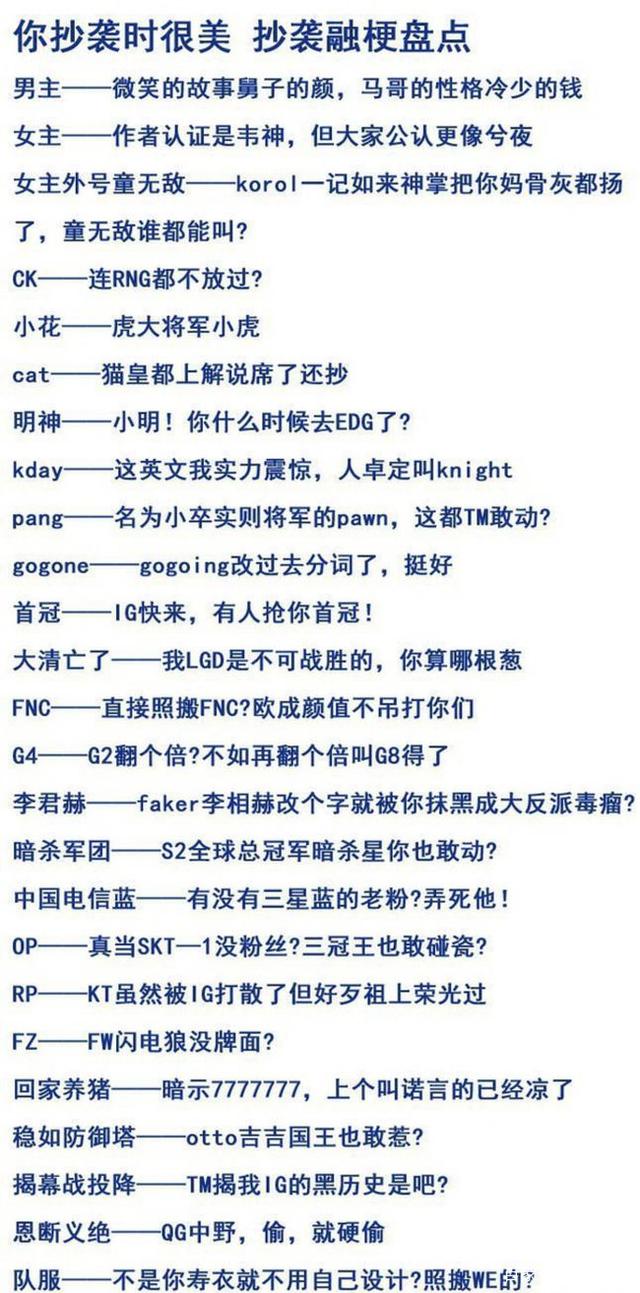 回归作品本身,无论是从小说名还是说到小说内容本身可以说作者把能抄的应该都用上了,看这本小说的时候几乎都可以在人物身上找到在LPL赛区对应的选手,甚至一个人物可以跟好几个选手对得上号,但是这名作者也是依旧拒绝承认。甚至还说自己是高学成的粉丝,强调自己没有消费高学成,但是在之前又说出是由于自己的小说才捧红了高学成的说法,这样的前后不搭属实让人倍感不适。蹭热度就说蹭热度,非得知错不认错还倒打一耙,也不怪有这么多的人会喷她。