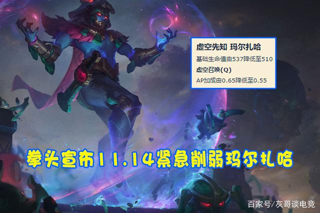 如果大家想用玛尔扎哈上分的话一定要趁早,因为拳头已经注意到了这个“中路混分怪”,他们大概是认为这种毫无操作和观赏性的英雄就不配火,于是决定在11.14版本中对其进行削弱,基础生命值和Q技能AP加成均被下调,对前中后期都有一定的影响。