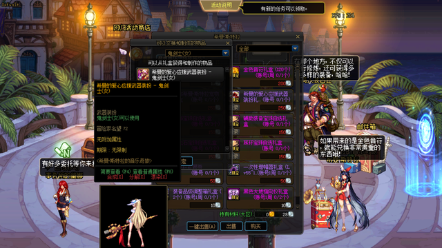 礼盒打开可以获得一个2500欢乐代币券的礼盒,而最重要的是刃影职业可以打开使用的第四期天空套,2种颜色自选,永久的一套天空。