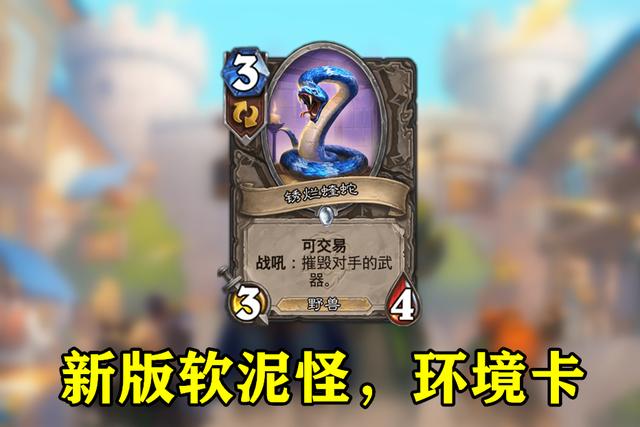 锈烂蝰蛇是一张3费的中立随从,3-4身材,战吼效果可以摧毁对手的武器。说白了,其实这就是一张新版的软泥怪,和红软有相反的身材。但是,锈烂蝰蛇更加好用。如果我们能通过对手打出的卡牌判断出是否携带武器,我们就可以留着锈烂蝰蛇摧毁武器,或者直接用它过牌。