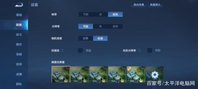 第一轮测试,我们同时进入两台游戏的设置界面,在“图像”中将帧率同时选择“超高帧”,分辨率设置为“节能”,画面总质量设置为“节能”,关闭动态分辨率选项,剩余的设置也都保持一致,具体设置如图所示: