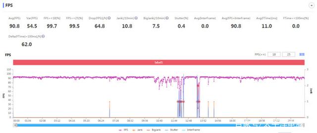 为了得出骁龙888手机的正常帧率图,待骁龙888手机静止冷却一个小时后,我们使用同样的画质设置对其再进行了一遍20分钟《王者荣耀》超高帧率的测试,得到的帧率图如下: