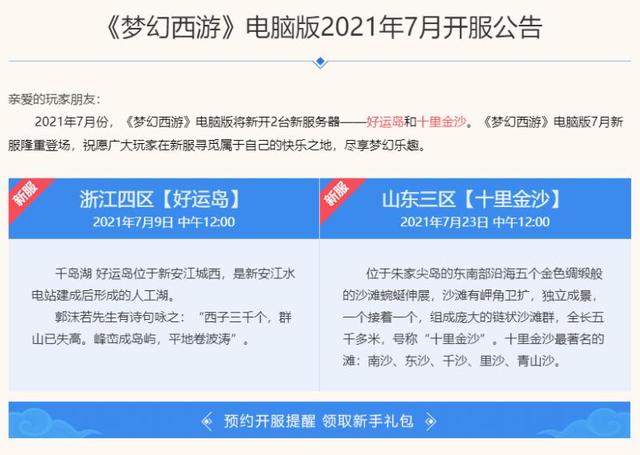 虽然现在梦幻玩家的数量不多了,但是官方在每个月还是会固定的开启两个新的服务器,七月份的两个新服务器的名字已经公布了,他们分别是好运岛和十里金沙,但是看到这两个服务器的服务器名称的时候小编就想到了一个词汇,那就是黔驴技穷,因为这两个服务器的服务名称实在是太low了,完全没有梦幻早期的策划人员起的服务器名称好听。