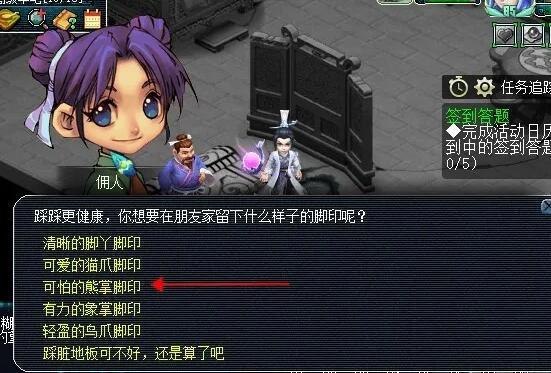 这个任务是房屋系统中的,拥有房屋的玩家可以找自己的仆人领取踩脚印的任务,踩脚印的任务类型总共有五个,每天能够完成两次,每个类型的脚印完成之后获得的奖励都是不一样的。
