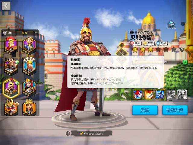 其次要练的就是贝利撒留,相比较洛哈的辅助作用,贝利主要可以提升行军速度,也就是说这个统帅能使你支援和打野更快,升级自然也快很多,这两个将领可以说是相辅相成的,因为贝利的技能也能提高对野蛮人的伤害,同时贝利还是骑兵将领,扫田和打羊都非常好用。