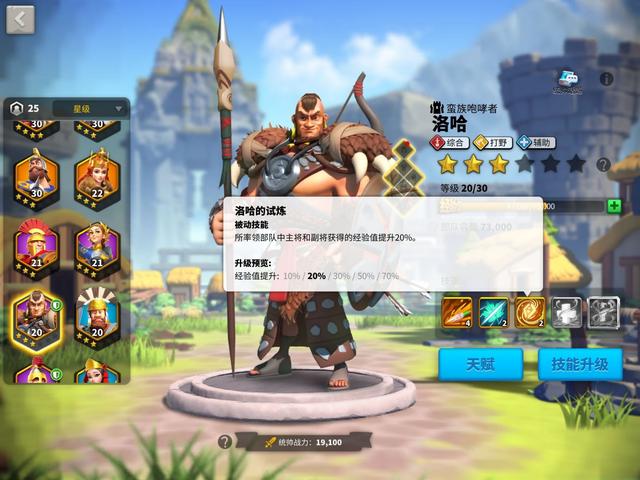 当建筑风格选择好之后,就是选择升级的统帅,这里第一个练的统帅是洛哈,新手玩家通过做任务就能获得,洛哈的好处就是提升经验,技能和天赋点满,差不多可以提高一倍的经验值,也就是说别人练一个统帅,你可以练两个,而且洛哈的技能对野蛮人有伤害提升,打起来更快一些。