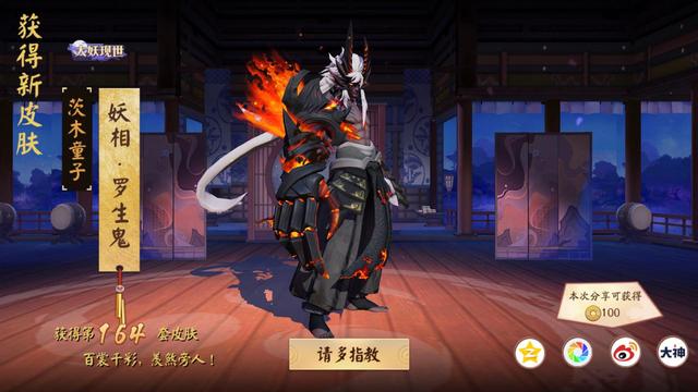 Hugo叔就凭这个金达摩,成功抽到一个已有的酒吞大妖皮,重复领取系统直接置换成150达摩币,这是一个金达摩的最高价值了吧,可比四十抽送的100币还多,可惜一时兴奋忘了截图。不过Hugo叔早上十连抽时也抽到茨木的大妖皮,看来应该是没有调低出好皮肤的概率,欧了欧了。