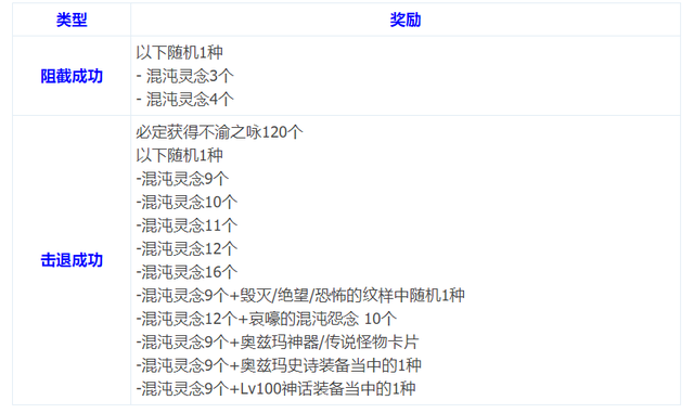 奥兹玛引导模式奖励:拦截成功“混沌灵念3个,混沌灵念4个”,成功击退“必定获得不渝之咏120个,材料10选1(随机)”