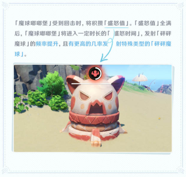 魔球嘟嘟堡发怒状态!魔球嘟嘟堡有一个发怒状态,这个很多玩家都知道。这个发怒状态是在魔球嘟嘟堡的【盛怒值】满后,就会自动开启进入【盛怒时间】。魔球嘟嘟堡受到回击伤害时,就会积攒一定的盛怒值。盛怒时间则是攻击频率提高,且会发射一些特殊魔球。特殊魔球有很多种类,同时也都有各自不同的效果。有回击失败时对玩家造成负面效果的魔球,也有如果回击成功就会造成更高伤害的魔球,甚至还有能引诱魔球嘟嘟堡发射魔球的魔球(套娃)。总的来说这些魔球有的能被玩家利用,有的能对玩家造成效果。不过不管如何,只要玩家能全部成功回击,那对玩家就没有太大的威胁。所以说到底,还是需要玩家的技术要跟上。