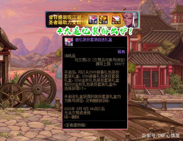 圣者遗物箱被调侃为“龙盒”,为了结合刃影职业,7.08版本加入3个道具,除了装备提升礼盒(30个)和亚贝罗亲选宝珠自选外,追忆装扮套装引起玩家注意。“昔日盛装现江湖,圣者遗物箱助力变靓仔”,4大绝版装扮浮出水面。