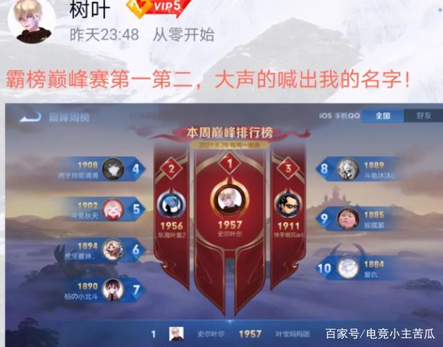 有意思的是,新赛季目前为止,巅峰赛榜可是变天了,野王的时代感觉过去了,毕竟北慕的名字都看不见了,很神奇。这个时候,另一个人站起来了,他开始称霸巅峰赛了,拿下了榜一和榜二,他就是虎牙主播树叶。
