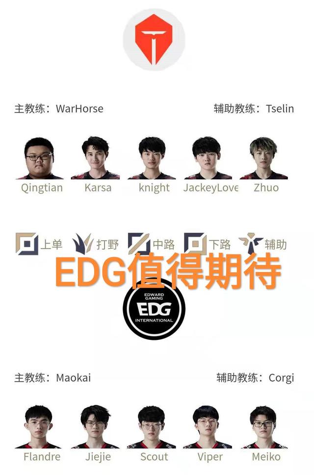 这两场比赛应该算是很多玩家关注的焦点了,rng战队目前的整体状态调整很一般,和各大战队都能够打的有来有回,但是总是不能够拿到胜利。接下来的11.14版本中,中单法师将会回归,到时候看一下rng战队能否调整好BP。感觉rng战队应该会2比0击败SN战队,同时edg战队也会2比1击败tes战队,现在的edg战队。无论是团队配合还是阵容选择都太出色了。
