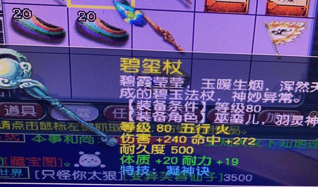 上面的这把武器是玩家使用高级藏宝图挖出来的,因为使用高级藏宝图挖出环装时就相当鉴定,是有可能会出现蓝字的,而这把80级武器的伤害属性是240,增加了20点体质和19点耐力,另外还附带了凝神决特技,这样的装备是有用的,就比如给那些专业抓宝宝的玩家,使用拥有凝神决特技可以增强自己的续航能力,可以在战斗中给自己补充蓝量,那么你认为上面的这把武器能卖多少钱?能不能把这张高级藏宝图的成本赚回来?