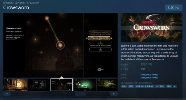 近日,游戏开发商Mongoose Rodeo在社交平台上发布消息称,横版闯关游戏《鸦之咒誓(Crowsworn)》现已登陆Steam平台,并将于2021年7月10日开启众筹活动。目前该游戏具体发售时间还未公布,暂不支持简体中文。感兴趣的玩家可以登录Steam商店页面添加该游戏至愿望单等待后续发售。
