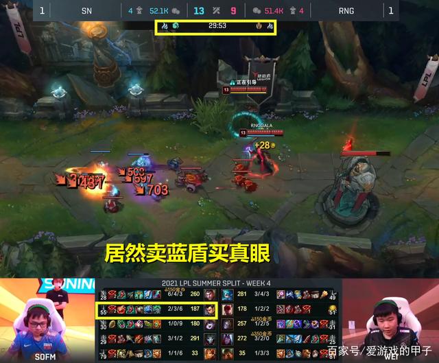 但是过了2秒钟,Sofm居然把蓝盾卖了,转而买了2个真眼,这个操作着实让人看不懂,既然能够买大件装备,为何又卖了买散件装备呢?SN这边是需要Sofm的赵信开团的,他必须要有很强的坦度才行。