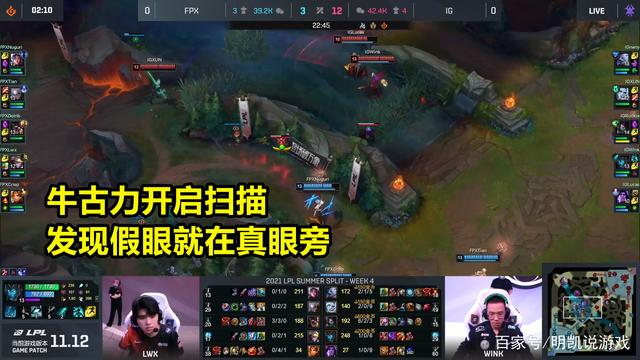 但经过自己的观察,发现在这其中间隔的47秒内,IG没能获知FPX这一真眼的位置。既然都不知道真眼的位置,主动放置假眼卡视野的操作就是无稽之谈了。