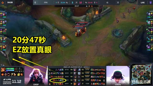 20分47秒,林伟翔的EZ放置了上文里的真眼21分34秒,IG辅助宝石在FPX真眼旁边放下了假眼,随后回城